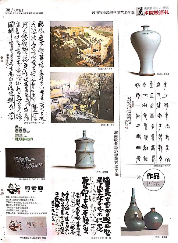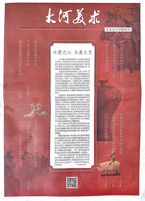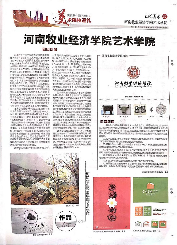近日,《大河美术“美术设计学院特刊”》对我校开云kaiyun官方网站及教师作品进行了专版介绍,此次特刊一共报道省内十二所本科院校开云kaiyun官方网站的办学情况和师生作品。我校开云kaiyun官方网站简介被大量篇幅报道,其中,大师董晓峰代表作品陶瓷,卜可的绘画作品、粱磊和卞卡的设计作品以及黄一凡的书法作品也被一一刊登展示。