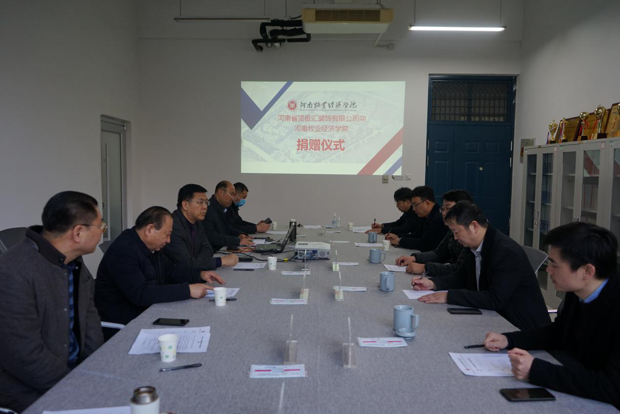 12月10日上午,我校校企合作单位河南省顶级汇装饰设计有限公司与学校签订资金捐赠协议,该公司捐赠50万元用于产业学院建设工作。仪式在龙子湖校区一号教学楼200-1室举行,副校长张卫宪、“顶极汇”有限公司董事长熊书国、总经理孙希明等领导出席仪式,校财务处、社会服务办公室负责人,开云kaiyun官方网站领导班子成员等同志参加,签字仪式由社会服务办公室主任胡迎利主持。