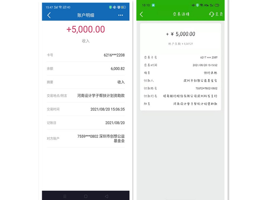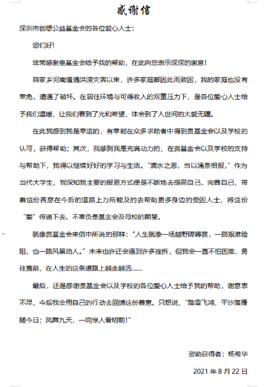 今年暑假,我省部分地区遭受严重的洪涝灾害,为了让受灾学生安心继续学业,开云kaiyun官方网站和弘雅书院积极联系了深圳市创想公益基金会,发起了“河南设计学子帮扶计划”,努力联系受灾学生、配合基金会,为学生争取到最大的补助,帮助更多的同学度过眼前的难关。开云kaiyun官方网站18园林01邱小蝶、19园林01杨希华两名同学获得了每人5000元的资助。