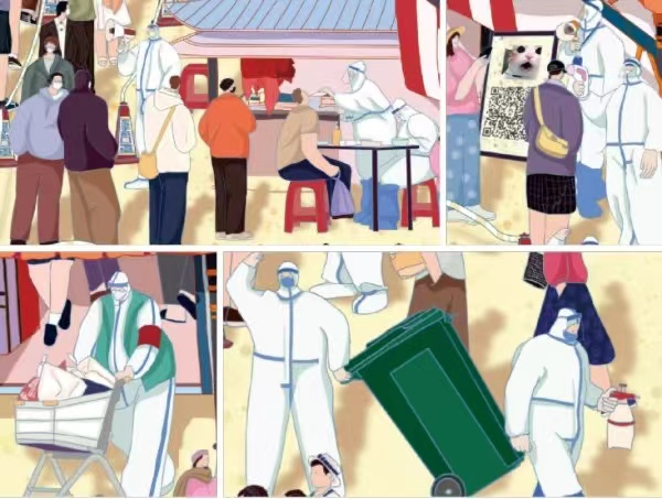 在高慧同学绘制的现代版《清明上河图》中,做核酸、拍婚纱、滑滑板、抠手机……这些只能在现代都市出现的生活场景,竟然穿越千年,重现在画中。2022年的5月,因为疫情,在被隔离的大学校园里,有人抓紧研读,有人如坐针毡,有人颓废抑郁,而高慧这个大四女生则安之若素,在专业教师王丽莉老师的指导下花费了整整半年时间,精心绘制、修改了四轮,完成了她的这套毕业设计作品。让人感动的是,高慧同学完成毕业作品的最后的一周,竟然是学校出现疫情,学生完全封闭在宿舍的特殊环境里,完成了作品的修改定稿。