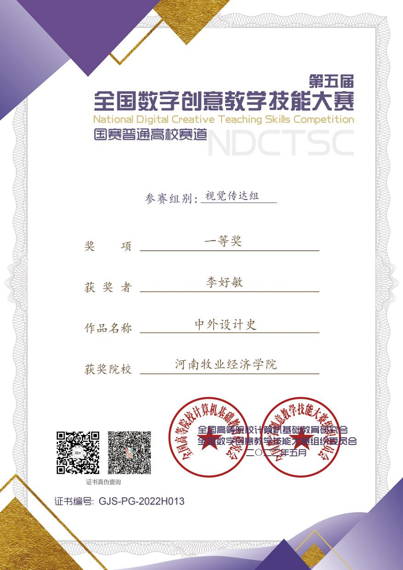 开云官网教师李好敏在第五届全国数字创意教学技能大赛[普通高等院校赛道]中,获视觉传达设计组一等奖。据官方公示数据,第五届全国数字创意大赛共设立了30个分赛区共收到507所普通高等院校的3500余位教师的投稿作品,最终推荐898部优秀作品进入全国决赛。