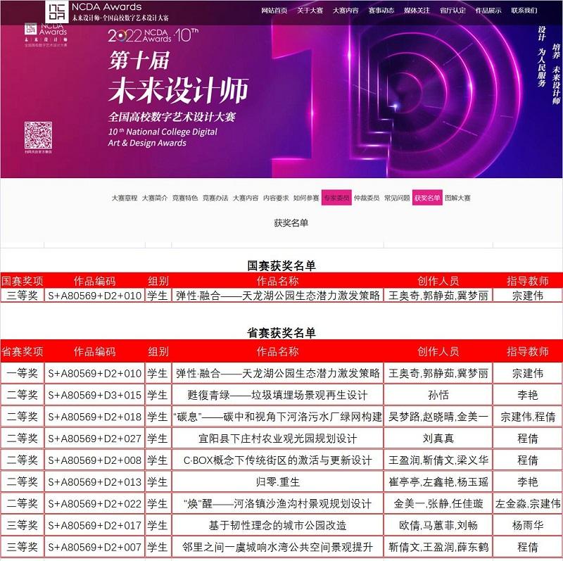 近日,由工业和信息化部人才交流中心主办的“第十届未来设计师·全国高校数字艺术设计大赛”(NCDA)顺利落下帷幕,开云官网园林学子摘得国家三等奖1项,河南省一等奖1项、二等奖6项、三等奖2项。