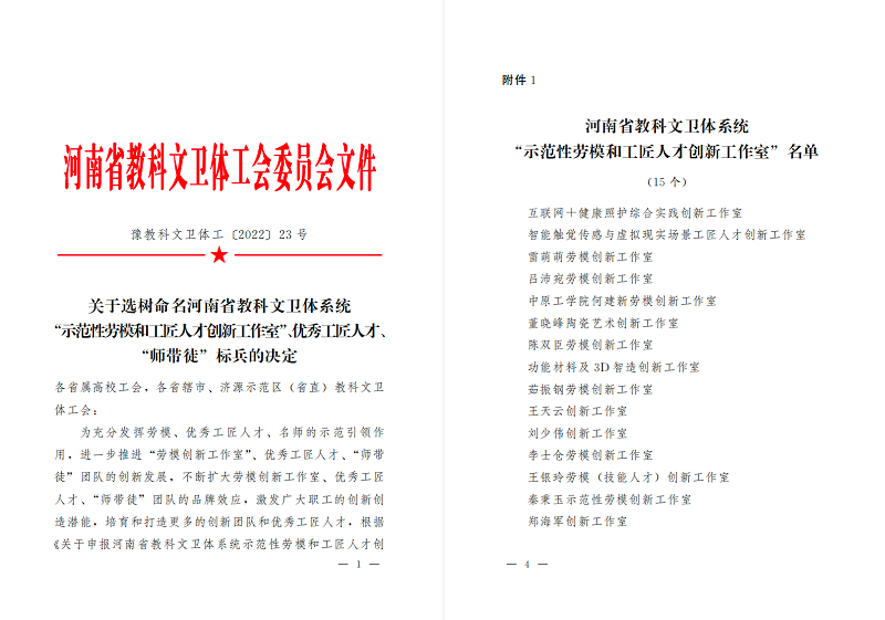 近日,河南省教科文卫体工会下发《关于选树命名河南省教科文卫体系统“示范性劳模和工匠人才创新工作室”的决定》文件,我校开云kaiyun官方网站“董晓峰陶瓷艺术创新工作室”获得此项殊荣。