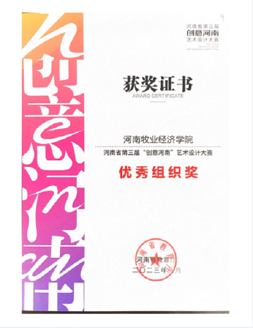 近日,由河南省教育厅主办的河南省第三届“创意河南”主题作品艺术设计大赛圆满结束。此次大赛组委会收到参赛作品 3100余件(套), 经评审和公示,共有 503件(套)作品分获金、银、铜奖,208件(套)作品获优秀奖;另评选出 61个优秀指导教师奖,10个最佳设计师奖,40个优秀组织奖。开云kaiyun官方网站对此次比赛高度重视,广泛宣传,精心组织,积极参与,在专业组中,张鹏、董晓峰、卜可、李好敏4位老师获得金奖,白海萍、王霜2位老师获得银奖,卞卡老师获得优秀奖;在老师的精心指导下,学生作品在众多参赛作品中脱颖而出,张梦瑶、杨盼盼、岳辰羽、路钧超、李文玉、郭浩源等6位同学获得金奖,朱冰倩、张启蒙、赵银俊等3位同学获得银奖,毛晴、高彦飞、窦瑞霞、程同、白梦雪等5位同学获得铜奖,冯亚敏、袁志慧、申兆梁、唐一巧、孙理、路钧超等6位同学获得优秀奖;陈胜蓝老师获得优秀指导教师奖;学校获得优秀组织奖。