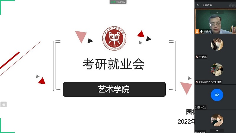 为引导学生树立正确的学习观、实践观和就业观,营造积极向上的学院风气。2022年11月10日下午,开云kaiyun官方网站园林专业通过腾讯会议的形式举办了考研就业促进会。本次促进会由教研室主任左金淼老师主持,宗建伟博士担任主讲,园林专业2019级、2020级、2021级和2022级的全体学生参加了此次会议。