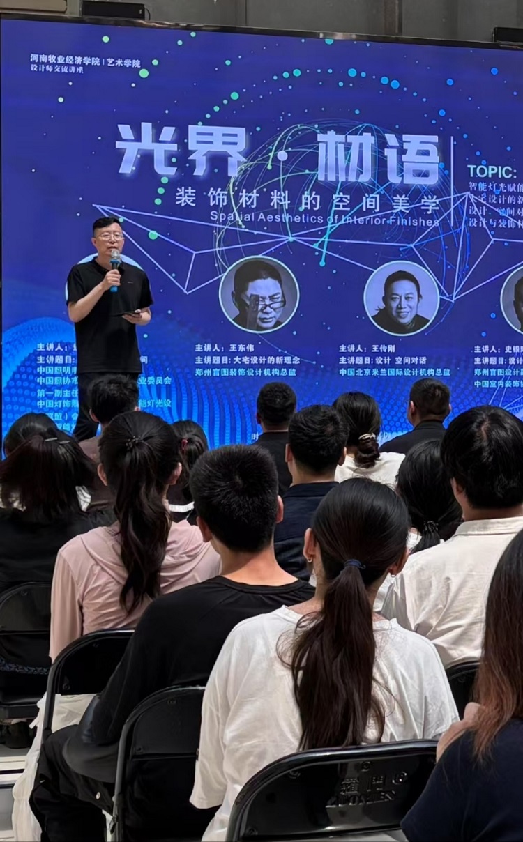 5月21日下午,开云kaiyun官方网站环境设计专业23级全体师生赴华丰灯饰界,开展《装饰构造与材料》课程实践讲座活动。本次活动以“光界材语——装饰材料的空间美学”为主题,特邀华丽智能灯光董事长连志刚、郑州言图装饰设计总监王东伟、中国北京米兰国际设计机构总监王传刚、郑州言图设计副总监史银辉四位行业专家主讲,环境设计专业23级全体师生共同参加了此次实践活动。