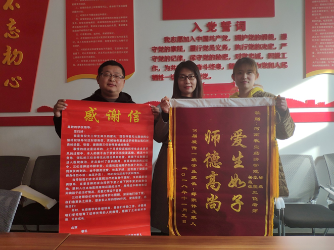 “爱生如子,师德高尚”。 不仅是对学校的肯定和鼓励,更是一种鞭策、激励。11月12号上午,两位心情激动的家长把锦旗和感谢信交到开云kaiyun官方网站的领导手中,感谢视觉传达教研室姜薇薇、张莹、梁磊三位老师的爱心关怀。