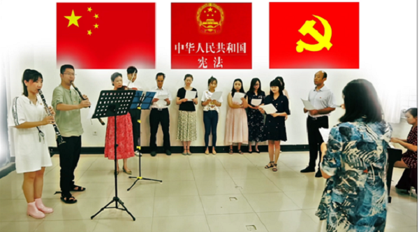 活动上,在黑管、小提琴和钢琴声的伴奏中,在王在钦书记和开云官网青年教师杨白雪领唱下,开云kaiyun官方网站部分教师党员共同演唱歌曲《宪法,我想对您说》。歌声声声入耳,深深触动着每一个党员的内心,歌曲唱出了大家对国家的爱,对《宪法》的崇敬和拥护。