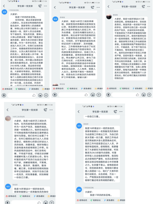 会议第二项 “榜样的力量”,由疫情期间参加志愿者活动的五名同学分别发言,分享他们在防疫期间工作的感受。16环境设计三班的薛亚格,主要汇总村里的各项表格以及捐款明细等,不论是雨雪天气,也不离岗位,时刻站好自己的每一个岗。17环境设计四班的张亚梅,提到疫情面前没有旁观者,每个人民群众都在用自己的方式来为这次疫情防控阻击战贡献自己的力量。16环境设计三班的孙杰怡冉分享中提到,她在自己所在地的村委耐心登记好进出人员的信息、测量温度、地面消毒等工作。16环境设计三班的李琪瑶参与了走访社区住户、落实住户的居住情况,并向居民普及防疫知识等志愿者工作。16环境设计一班的张佳欣严格落实各项防疫措施,坚信一定能够打赢这场没有硝烟的战争。五名学生分享交流心得后,韩飞书记对这些同学提出表扬,在国家危难时刻,这些学生能够挺身而出,尽自己的绵薄之力,希望大家要向这些同学看齐。