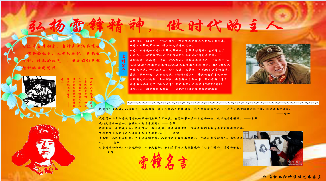 1、我系在三月开展雷锋月学习雷锋精神系列活动。雷锋精神是中华民族传统美德的集中体现,闪耀着共产主义思想的光辉,也反映了社会主义新人的精神风貌和时代特征。作为艺术系传统教育活动,所有同学都积极参加了班上及系内组织开展的学雷锋活动。在这特别的日子里,我系通过公告栏张贴学习雷锋海报、展板展出以及微博微信公众平台多渠道共同宣传。