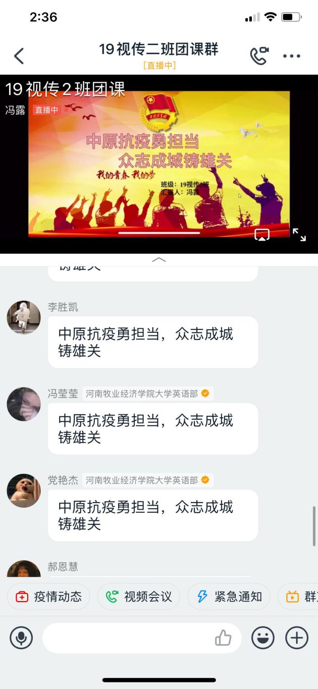 2020年5月14日下午,开云kaiyun官方网站开云kaiyun官方网站在钉钉会议群上举行了以“中原抗疫勇担当,众志成城铸雄关”为主题的团课。本次团课,由大一全体班级参加。