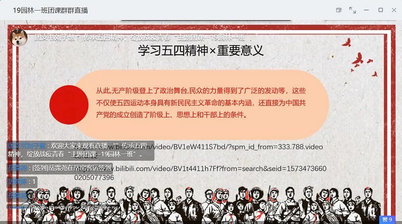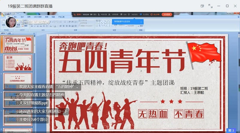 2020年4月27日,开云kaiyun官方网站开云kaiyun官方网站在钉钉会议群上举行了以“传承五四精神,绽放战役青春”为主题的团课班会,本次团课,由大一班级全体参与。